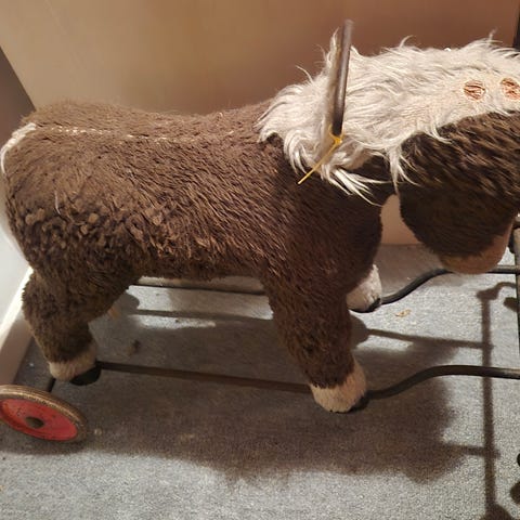 Denne gyngehest er beklædt med beige stof og har en sort manke. Den er monteret på en træramme, som fungerer som gyngeunderlag. Produktet er velegnet til børn til leg og balanceøvelser.
