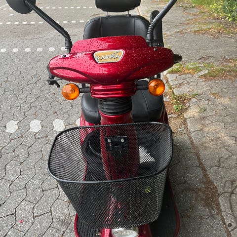Modellen hedder: Shoprider Country Deluxe og har trådkurv til opbevaring foran og påmonteret stokholder bagpå.