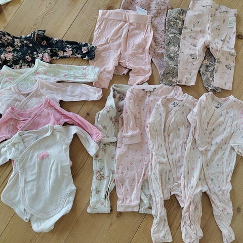 3 x hjemmestrikkede / hæklede tæpper, hjemmestrikket heldragt, kjole, strømper, vanter, veste og suttesnore. Derudover et par ultrabløde strømper i merinould fra Dilling.
