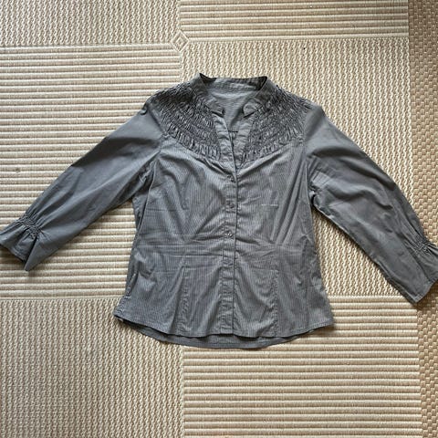 HELT NY ...Virkelig flot grå stof med sølv . Smuk detalje ved halsen. Knapper med stof . Slids i siderne .