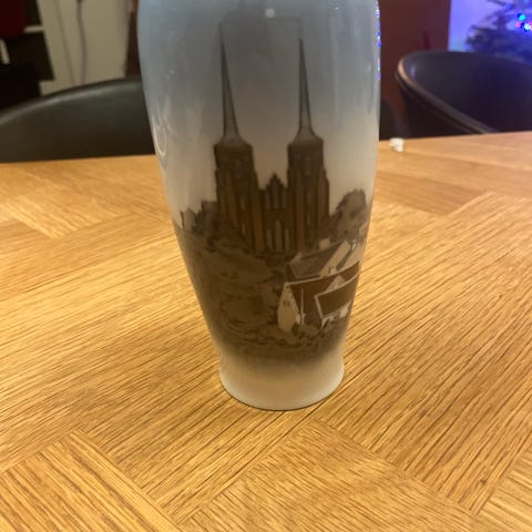 Den høje vase med motiv af Roskilde Domkirke er solgt