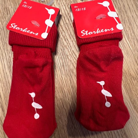 Under bunden er der et gummi mærke af en Stork. Jeg har flere sokker i samme størrelse. Jeg har ikke andre størrelser end 13/15.