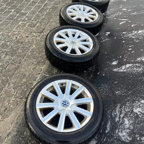 Meget fine alufælge fra VW model Borbet, påmonteret med næsten nye vinterdæk, har maks. kørt 4.000 km.