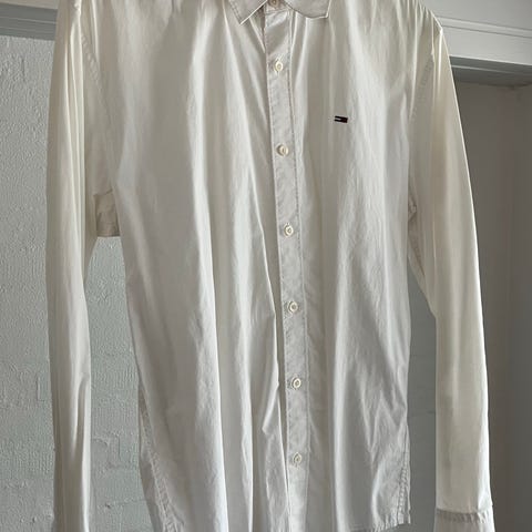 Tommy Hilfiger Jeans skjorte i hvid, størrelse XS Slim Fit til herre. Skjorten har lange ærmer og knaplukning foran. Den fremstår som ny.