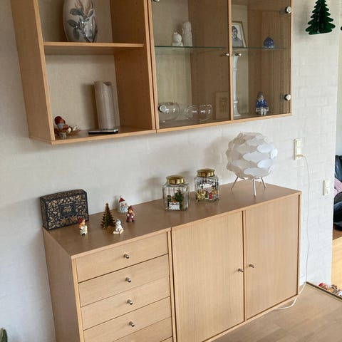 Denka reoler i lyst træ med to låger og hylder