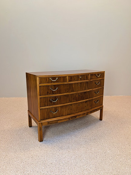 Front med otte skuffer med patineret messinggreb. Udført 1960'erne hos P. Lauritsen & Søn.
