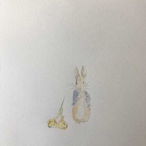 Akvarel med illustration fra Peter kanin af Helene Beatrix Potter