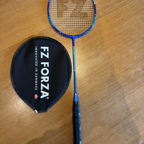 FZ Forza badmintonketcher med tilhørende taske. Ketcheren har blå greb og sort ramme med gule detaljer. Tasken er sort med hvidt FZ Forza logo og har skulderrem til transport. Sættet er egnet til badmintonspil og opbevaring af udstyr.