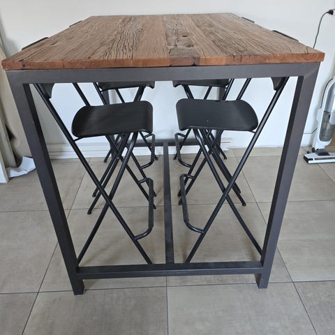 Solidt højt barbord med to barstole.