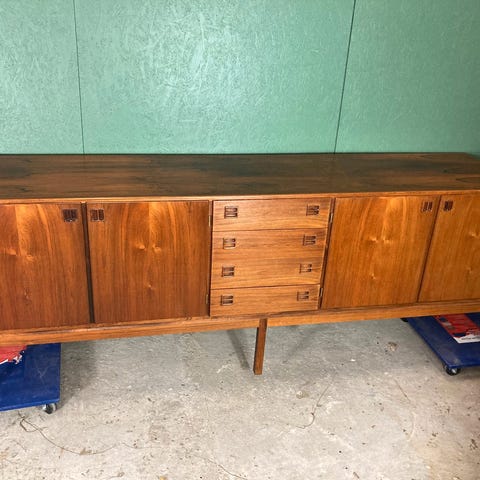 Super smuk og sjældent udbudt Poul M. Jessen skænk for PMJ Viby møbler. I massiv og fineret palisander, buet form. Tre låger foroven, med bar i midten, og hylder i det to andre. 4 skuffer under og nederst tre låger. Stemplet Poul M. Jessen samt mærke fra PMJ Denmark en af skufferne er stemplet med dato fra 1965. I flot stand med meget få brugsspor. Et virkeligt fund der vil pynte i et hvert hjem. L200 cm. B45 cm. H128,5 cm. Kan ses ved Thisted. Set på internationalte sider til 14.000kr.