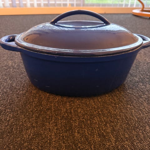 Fontignac Emaljeret oval Gryde med en diameter på 28 cm og en rund på 24 cm i blå farve. Gryden er lavet af støbejern med emaljeret overflade, hvilket sikrer god varmefordeling og holdbarhed. Egnet til forskellige madlavningsformål og kan anvendes på flere varmekilder bl.a i ovn og på alle slags komfurer.
