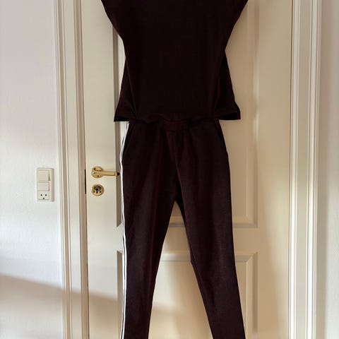 Bukser og bluse hænger sammen men fremstår som to dele .