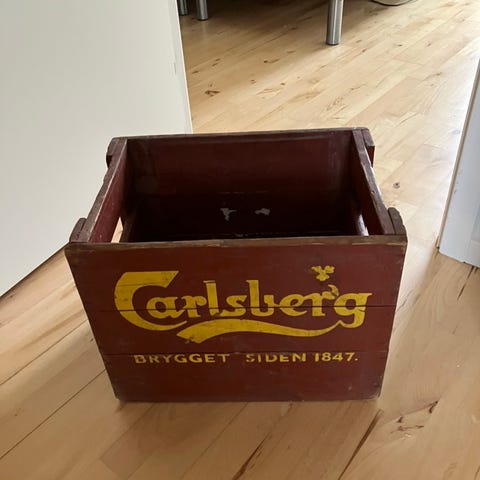 Carlsberg ølkasse malet i rød. Kassen kan bruges til opbevaring eller transport af forskellige genstande.