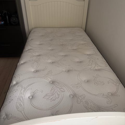 (IKEA eller JYSK) Seng med og madras (efterkøbt i tyk og god kvalitet fra BabySam). Sengen har en træramme med spiler i siden. Madras og betræk er inkluderet. Inklusiv polstret sengekant. Sengen er egnet til børneværelse eller gæsteværelse. Der er et læs lagner og 2 vådliggerlagner i platikposen.