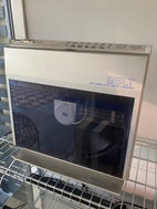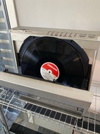 Her køber du en smukt 80’er opretstående pladespiller - dog defekt - MEN kan heltsikkert laves. Dyret lyser og pu armen kører ind.