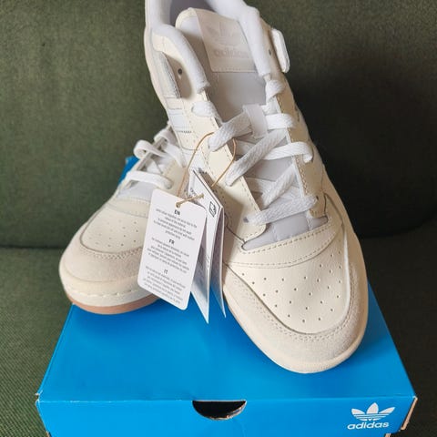 Adidas Fervnova Court herresko i størrelse 44. Skoene er hvide med blå og røde detaljer. Designet til indendørs brug med en slidstærk gummisål for god greb på banen.