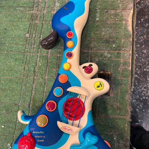 Lille rangle udformet som guitar. Kan rasle.
