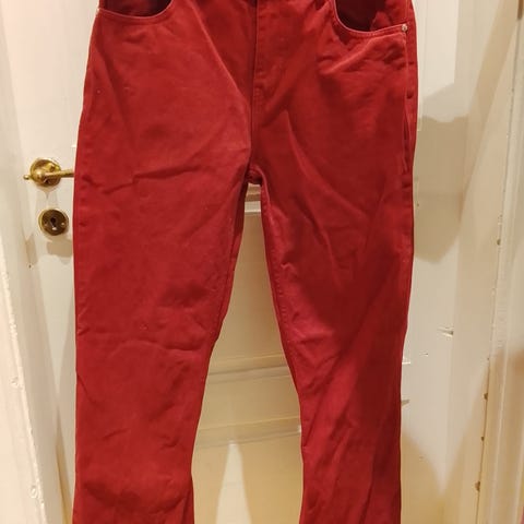 2NDDAY bukser i størrelse 36, i en smuk dyb rød farve hvor der er vævet en lille guldtråd ind i stoffet. Det ses stort set ikke, men det giver et smukt spil i i farven. Der er lynlås i siden, presfolder og bukserne har lige ben. De falder rigtig flot og får et lille svaj forneden når man bær dem. Både min søster og jeg har købt disse bukser, da de er super flotte og sidder rigtig godt. Desværre er dette par købt i en forkert størrelse, så de har stort set ikke været brugt, og ser ud som nye.