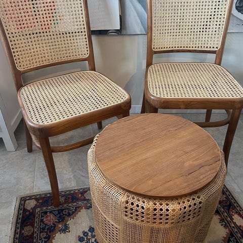 To stabile træstole der skal have nyt (flet) sæde. Sædehøjde uden hynde 39 cm.