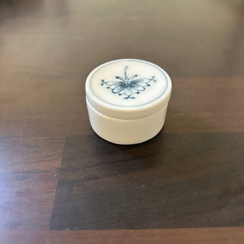 2 stk musselmalede riflet kuvert peberbøsser, sælges samlet