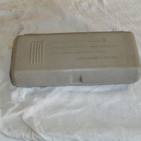 Fin lille original Fiat grå værktøjskasse med udstyr.