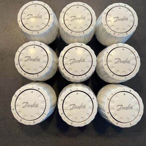 Danfoss Termostatventilhoveder model 013G2010. Sæt bestående af tre termostatventilhoveder i forskellige farver. Anvendes til regulering af varme i radiatorer. Materiale og specifikke dimensioner ikke angivet. Priser fra 50kr