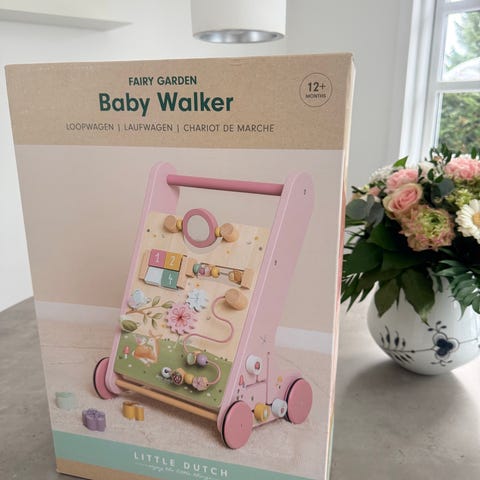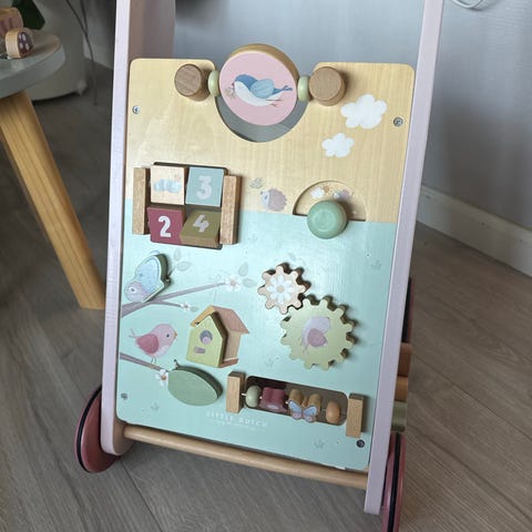 Little Dutch Børnevogn med aktivitetsfunktioner, lavet af træ med rosa detaljer. Designet til børn til støtte ved gang og motorisk udvikling. Indeholder forskellige bevægelige dele og aktiviteter på frontpanelet.