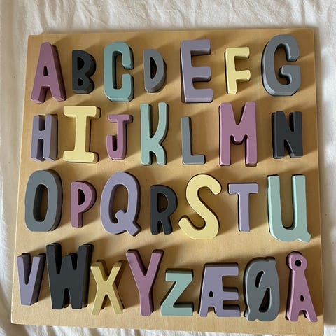 Bogstav T fra Sebra Wooden Letters i træ med farven “pastel dreng”, også kaldet petroleum eller støvet blå nogle steder. I kirsebærtræ.