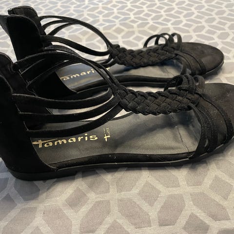 Tamaris sandaler i størrelse 39 med sort farve. Sandalerne har et åbent design med krydsede remme og en lukning bagpå. Materialet fremstår som en kombination af tekstil og syntetisk materiale. Velegnet til hverdagsbrug i varmere vejr.