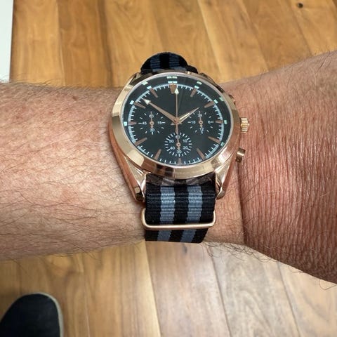 Chronotech Highway, batteri drevet, Foldelås, låg med skruer, 5 ATM WATER, Stainless steel,med sort sten midt på kronen, dato viser, hård glasset uden ridser, urkasse er pæn, virker som det skal, bredde er 38mm inkl kronen, højde 45mm. Mellem hornene 20mm. sender kun med postnord eller afhente
