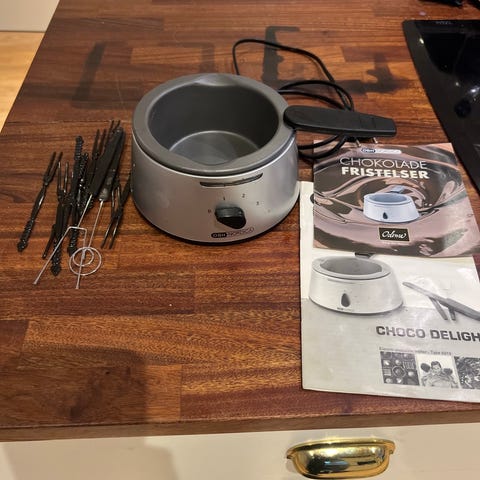 UNITED CF2021 chokoladefondue i rød farve med en kapacitet på 0,25 liter. En elektrisk fondue-enhed designet til at smelte chokolade hurtigt og nemt. Udstyret med temperaturkontrol og en varmeplade, der sikrer jævn opvarmning. Velegnet til at lave chokoladefondue til mindre selskaber.