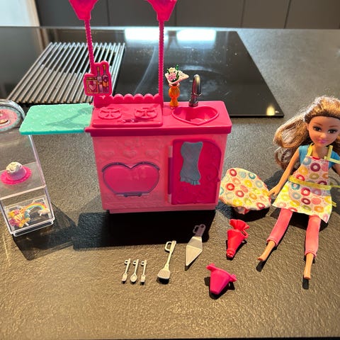 Barbie dukke og legekøkken sæt med tilbehør. Sættet inkluderer Barbie dukke og køkken. Legekøkkenet er i pink og hvid med ovn og komfur. Der medfølger bageudstyr som bageplade med cupcakes, røreskål og bagehandsker.