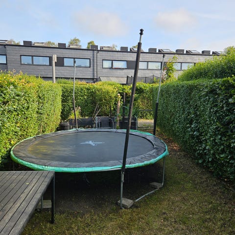 Vi sælger vores Berg Favorit 380 trampolin (diameter ca. 3,8 meter). Den har været flittigt brugt gennem årene, men fungerer stadig fint til masser af sjov i haven. Stellet er solidt og stabilt, og hoppefladen giver stadig et godt afsæt.