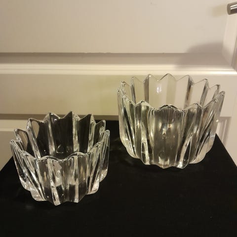2 Orrefors Crystal skåle med en diameter på cirka 18 og 11 cm. Skålene er fremstillet i klart glas med karakteristiske facetterede kanter. Velegnet til dekorative formål eller til servering. Materiale: Krystalglas.