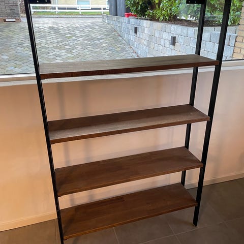 Nyatoh reol med sorte vægskinner. Alle dele købt i Silvan. Reolen kan samles lidt forskelligt efter ønske. Fik ikke taget billeder før den blevet taget ned, men fandt to ældre billeder- en hvor nederste hylde er samlet og benyttes som skrivebord og et billede hvor den står udelukkende som reol. Der er små ridser og på to hylder er der tussestreger. Så hylderne skal lige slibes en gang og have lidt olie.