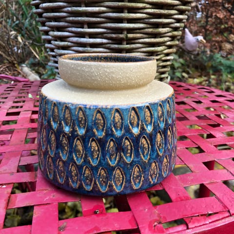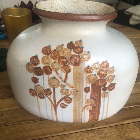 Søholm Denmark keramik vase med brun glasur. Vasen har en rund form med en bred åbning og dekorative detaljer, 9 cm høj, 9 cm diameter. Velegnet til dekoration i hjemmet.