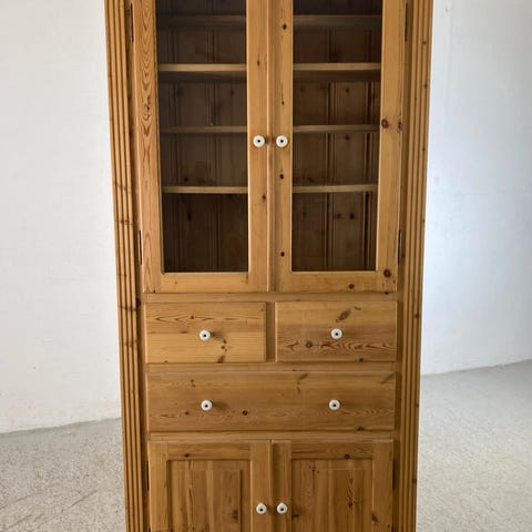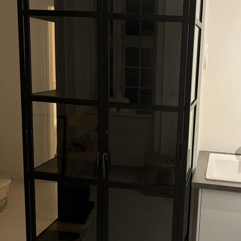 Nordal vitrineskab med patina træramme og glasruder. En høj vitrine med 5 indvendige hylder, glas i siderne, og et fint greb i messing. Farven er knækket hvid med sort ramme og patina look udvendig