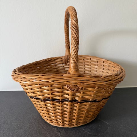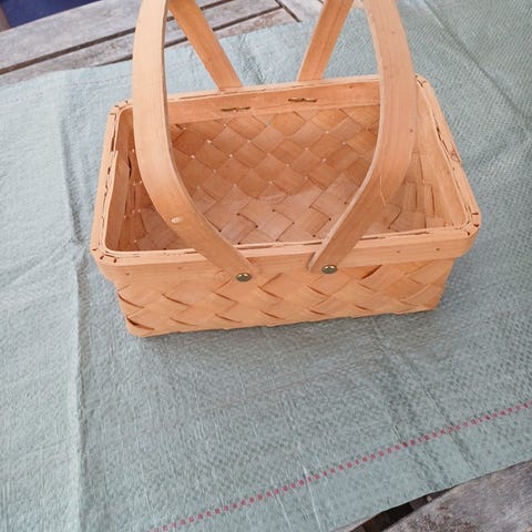 Skøn mindre firkantet spånkurv med solid hank i træ. Perfekt som æggekurv eller lille svampekurv :)