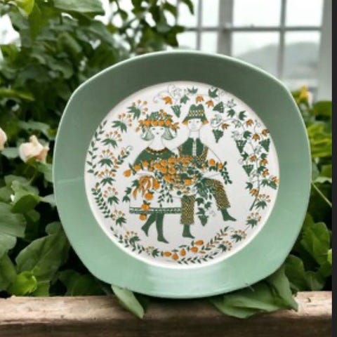 Farven på kopperne er ikke så skinnende som på tallerkenerne (de ser ud som om de aldrig har været brugt) ... måske har kopperne været i opvaskemaskinen - og en af dem har et par ridser i den blå dekoration.