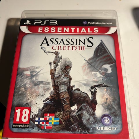 Ubisoft Assassin's Creed III Playstation 3 spil. Action-eventyrspil med historisk tema, egnet til Playstation 3 konsol. Spillet er aldersmærket 18 år og indeholder elementer af kamp og udforskning.
