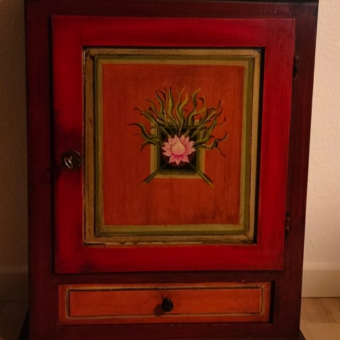 Specielt og meget gammelt tobaksskab/ vitrineskab fra mine bedsteforældres tid. Et virkelig flot skab lavet med mange udskæringer og håndværk. Skabet har været malet blåt og har en smuk og helt unik patina. Har ikke set andre magen til nogen steder.