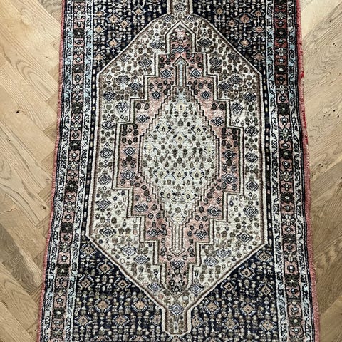 Smukt vintage persisk tæppe fra Iran, ca. 1960-70. Håndknyttet i uld med klassisk rød midtermedaljon og mørkblå kant.