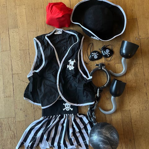 Piratkostume brugt en gang. Sælges med sabel. I rigtig god stand. Størrelse 7-9 år.