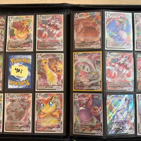Forskellige sjældne pokemonkort, både V, Vmax, Ex og ultrasjældne Trainers.