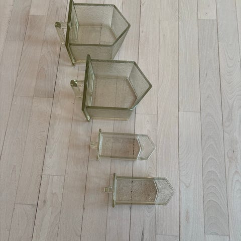 Klassiske skuffer til Københavnerskabe, både af glas, plastik og de hvide er selvsagt af porcelæn. Skufferne har forskellige mål, der ikke oplyses.