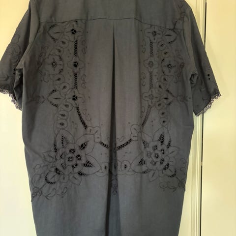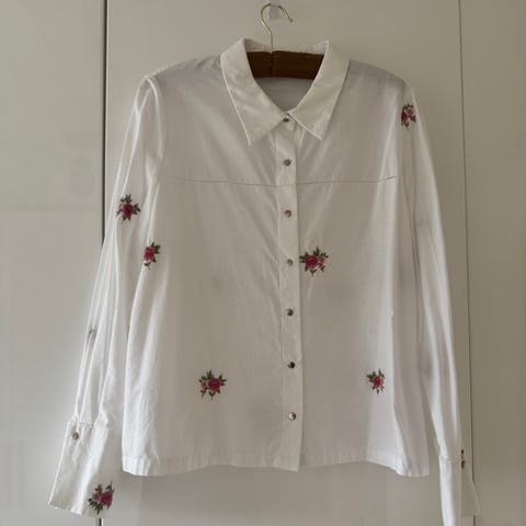 Hel unik dug er blevet til en unika skjorte. Kan slet ikke stå for, at det har været en gave til Jørn i 1954 fra mormor 🌸. Broderiet måtte selvfølgelig bevares. Str M/L.