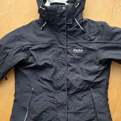 Peak Performance, Gore-Tex Jakke i størrelse S. Jakken har en kombination af rød, hvid og sort farve og er fremstillet med Gore-Tex materiale, som giver vandtæt og åndbar funktionalitet. Jakken har hætte (som kan lynes af) og flere praktisk lynlåslommer til f.eks. liftkortet.