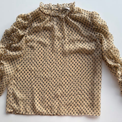 & Other Stories Bluse i guldfarve, størrelse L. Blusen har korte ærmer og et let transparent materiale med glitrende effekt. Designet med V-udskæring og taljesyning. Flot jule/nytårsbluse