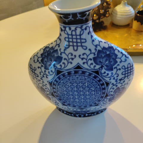 Kinesisk blå og hvid porcelæns vase med låg. Vasen har traditionelle blåmalede motiver og en rund form. Den er udstyret med en aftagelig låg med en lille knop. Undersiden har kinesiske tegn som mærkning. Vasen kan anvendes som dekorativ genstand i hjemmet.