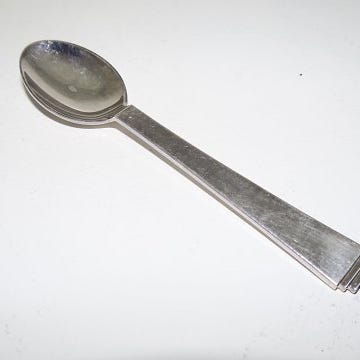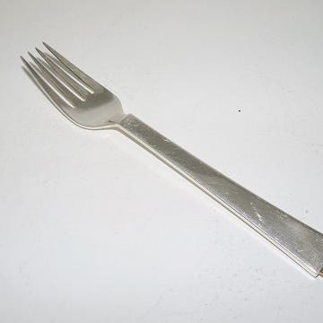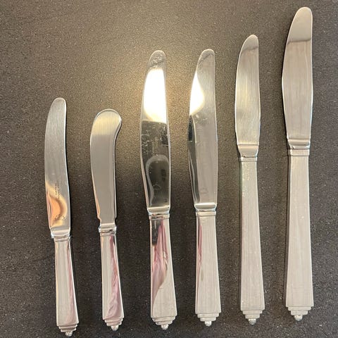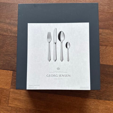 Pyramide bestik fra Georg Jensen Sølvplet: 8 knive lang, 8 Middagsgaffel, 8 Desert skeer. Sælges kun samlet.